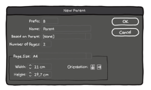 Bunlardan biri; page panelinin en sağında bulunan çizgiler var ya oraya tıklayıp “New Parent”ı seçerseniz karşına altta gördüğünüz panel çıkar. Sayfa ölçüleriniz direkt yazar zaten orda, Master için farklı bi ölçü vermeyecekseniz oraya hiç dokunmanıza gerek yok. Çalışma dosyanızda birden fazla Master açmanız gerekiyorsa hepsine isim vermeniz işinizi çok kolaylaştırır. “Name” kısmından (atıyorum “bölüm1”, “bölüm2” şeklinde) isim verebilirsiniz. Onun dışında yapmanız gereken başka bir ayar yok.