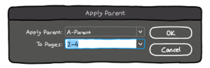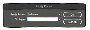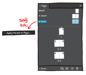 - Bu yolumuz da bi öncekine çok benzer aslında. Hatta tam tersi gibi. Bu sefer atamak istediğimiz Master sayfanın üstüne sağ tık yapıyoruz ve yine öncekinde olduğu gibi “Apply Parent to Pages”e tıklıyoruz. Bu sefer “Apply Parent” kısmında zaten seçtiğiniz, atamak istediğin Master’ın adı yazacak. “To Pages” kısmı da boş olacak. Oraya hangi sayfalarda bu Master olsun istiyorsanız onu yazmanız yeterli.