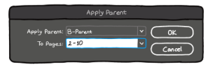 - Uygulamak istediğiniz sayfaları Page panelinden seçip sağ tık yaparsanız “Apply Parent to Pages” yazan bir seçenek göreceksiniz. Sonrasında bi pencere çıkıcak karşınıza. “Apply Parent” yazan yere hangi Master’ı eklemek istediğinizi girin. “To Pages” yazan kısımda zaten seçtiğiniz sayfa numaraları yazar ama değiştirmek isterseniz yine oradan değiştirebilirsiniz. Bu yöntemi birden fazla sayfaya Master atamak istediğinizde kullanabilirsiniz. 40 sayfaya tek tek sürükle bırak yapmak biraz eziyet olabilir çünkü.